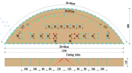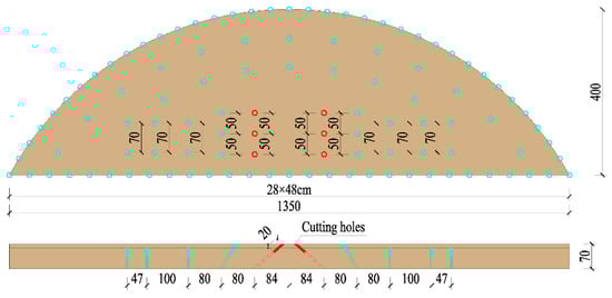 The tunnel was excavated using a three-step excavation method. The single-cycle footage of the upper step was 1 m; the excavation width was 13.5 m, the excavation height was 4 m, and the volume of single-cycle blasting rock was 38.2 m3. The angle between the cutting holes and the pale surface was 45°. The depth of the hole was 1.2 m and the distance of the distance was 0.5 m. The arrangement of holes on the palm surface is shown in Figure 2, and the blasting parameters are shown in Table 1.