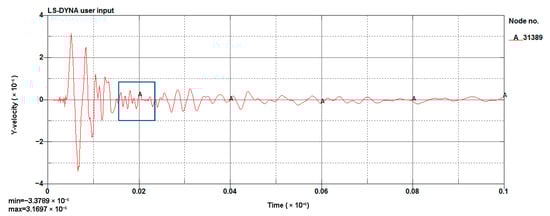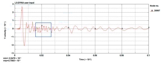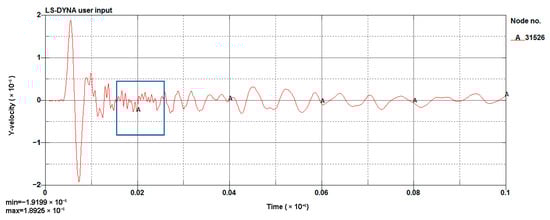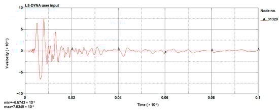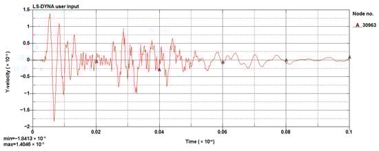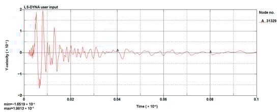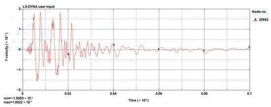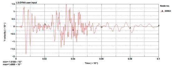 The LS-DYNA calculation of the model was performed, and the vibration velocity of point 31329, which was located directly above the palm surface, is shown in Figure 8. The maximum vibration velocity was 7.63 cm/s, at an approximate time of 0.008 s. Contrasting the test monitoring point waveform (the signal monitored #2 at event 1, Table 2), the maximum vibration velocity of the original signal (see Figure 9) was 7.55 cm/s, and the maximum vibration velocity time was around 0.006 s. The maximum vibration velocity generation time was different, because the monitoring data for the real and model trigger times were different. The model started timing at the time of detonation, while the actual instrument had a vibration trigger that occurred before timing. From the simulation results, it can be seen that the model reflected the relationship between the charge and the vibration velocity well and simulated the vibration of monitoring point #2 effectively.