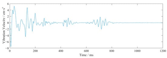 Figure 11 shows the simulation of a blasting waveform of a 1 m section above the palm surface. The vibration velocity of the waveform was 3.379 cm/s. Figure 12 shows the simulation of a blasting waveform of a 0.8 m section. The vibration velocity of this waveform was 2.709 cm/s. The simulation results were greater than the design requirements, and this scheme could not be applied in an engineering context.