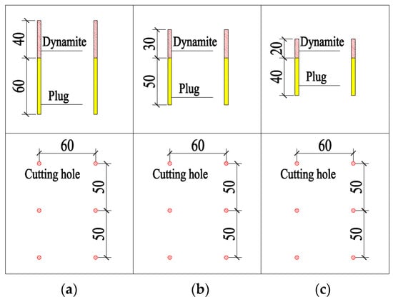 Optimal design of a 0.8 m section of tunnel (cm): (a) the charging length diagram. (b) Scheme A: the lower pairs of holes are detonated by the first segment detonator (0 ms), and the middle and upper are detonated by the second segment detonator (25 ms). (c) Scheme B: the middle pairs of holes are detonated by the first segment detonator (0 ms) and the lower and upper are detonated by the second segment detonator (25 ms).