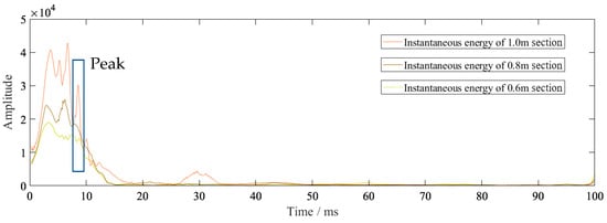 Figure 15 shows the instantaneous energy spectrum for 1 m, 0.8 m, and 0.6 m sections. It can be seen that the 1 m section produced a peak after the main energy and the 0.8 m section also had a similar result. This was due to the reflection of the layer. From the vibration velocity figures (Figure 11, Figure 12 and Figure 13), it can be seen that the vibration velocity entered a very small and unstable frequency blasting vibration (marked in the blue box) and then entered a relatively stable vibration. When reaching a relatively stable signal, we considered the blasting effect to be over. The very small and unstable frequency blasting vibration was partly a result of the main blasting vibration. It was also due to the reflection of the layer; the reflected waves resulted in mutual interference. Corresponding to the time in Figure 15, the instantaneous energy was very small.