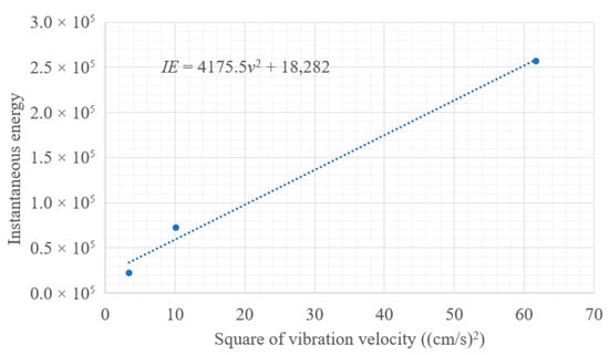 The relationship between vibration velocity and instantaneous energy are shown in Figure 19. The value of was 18,282. It can be seen from the figure that the square of velocity and instantaneous energy was a linear relationship. Because the blasting frequency range was mainly between 0~50 Hz, the energy related to frequency was invariant. It can be considered that, regardless of the magnitude of the vibration, the energy reflected by the frequency under the same geological conditions should be close to a fixed value. In this blasting project, the instantaneous energy value of 1.2 kg charge was 22,350 and it contained frequency energy of 18,282. The smaller the vibration velocity, the greater the proportion of energy reflected by frequency.