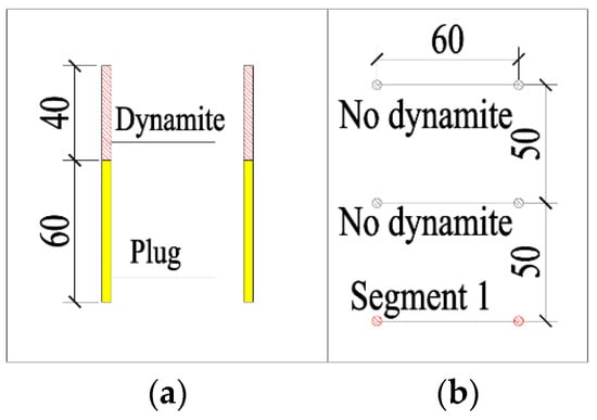 The results of blasting for the lower pairs of holes for a 1m section (cm): (a) the charging length diagram; (b) the segment arrangement of detonators.