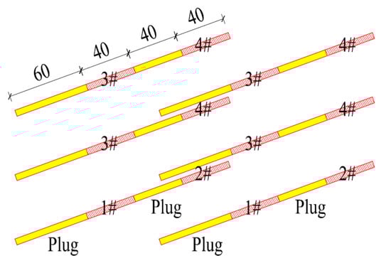 Based on the previous analysis, shortening the single-cycle footage and reducing the single blasting dynamite charge were the main methods for reducing the blasting vibrations. From the signal obtained using the test monitoring point (the signal monitored #2 at event 1; Table 2), for a 2 m section with the charge in blasting dynamite reaching 4.2 kg, the blasting vibration velocity reached 7.55 cm/s, which was much greater than the design requirements. By shortening the footage to reduce the charge of dynamite, the design was carried out on 1 m, 0.8 m, and 0.6 m sections, respectively. The design is shown in Figure 10 and the corresponding finite element models were established for the analysis.