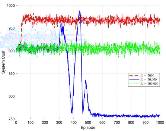 Figure 5 compares the algorithm’s performance for experience replay buffers of different sizes, denoted by R. When R = 5000, the algorithm reaches a local optimum around episode 70. However, due to the small size of the experience replay buffer, it fails to extract sufficient data feature information, leading to an inability to learn the optimal strategy. When R = 50,000, the algorithm converges to the global optimum at around episode 520. When R = 500,000, the algorithm fails to converge due to the excessively large experience replay buffer, resulting in a longer training time and insufficient data updates. Therefore, the optimal size of the experience replay buffer chosen in this paper is 50,000.
