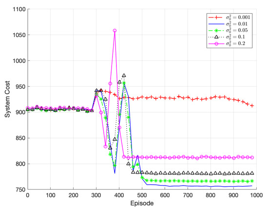 Figure 7 illustrates the comparison of the algorithm’s performance for different exploration parameters , which represents the exploration noise in the TODM_DDPG algorithm. Since the policy network outputs deterministic actions, exploration in TODM_DDPG relies on adding noise to the action space. In this case, the noise is represented by the variance parameter . When is set to 0.01, the algorithm eventually converges to the best result. Notably, as increases, the algorithm explores a larger action space, leading to faster convergence but a potentially larger noise distribution space. As shown in the figure, when is set to 0.2, the algorithm exhibits fluctuations around a system cost of approximately 820. When is set to 0.001, the exploration parameter is too small, resulting in a narrow range of generated action space, which can lead to convergence to local optima or an inability to converge. Therefore, the optimal exploration parameter chosen in this paper is = 0.01.