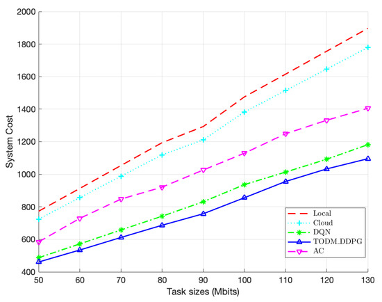 The comparison of performance of different algorithms is shown in Figure 9. We compare five different algorithms in this experiment: the AC algorithm, the TODM_DDPG algorithm, the DQN algorithm, the local offloading algorithm, and the cloud offloading algorithm. For the three reinforcement learning algorithms, the training iterations are set to 1000. It is evident from the figure that the three reinforcement learning algorithms implement significantly lower system costs compared to the local offloading and cloud offloading algorithms. However, the AC algorithm fails to converge during the training process due to the interaction between the actor and critic. This is because the action of the actor relies on the critic’s value, and updating both networks simultaneously when the critic’s value is challenging to converge may leads to instability. On the other hand, both the TODM_DDPG and DQN algorithms, with their dual network structures, effectively overcome this issue by breaking the correlation among training data and achieving convergence. However, the DQN algorithm fails to converge to the minimum system cost. This is mainly due to the fact that the DQN algorithm discretizes the action space of continuous actions, resulting in an inability to find the optimal offloading strategy accurately. In comparison, the TODM_DDPG algorithm performs best. Its ability to explore continuous action spaces enables it to find optimal solutions more effectively. Therefore, the TODM_DDPG algorithm demonstrates superior performance in terms of minimizing system cost.