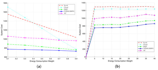 (a) Performance of system cost of different algorithms under different energy consumption weights. (b) Performance of system cost of different algorithms under different number of vehicles.