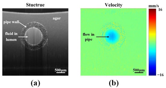 Figure 2 illustrates typical OCT images of a polyethylene capillary phantom. The capillary, with an inner diameter of 0.5 mm and an outer diameter of 0.8 mm, was filled using a microsyringe pump (Genie Touch, Kent Scientific, CT, USA). The capillary was immersed in a 5% agar solution to reduce the structural deformation caused by the optical path length difference. Figure 2a displays the structural image, and Figure 2b shows the flow velocity image. Both structural and flow velocity images were obtained from the same raw data using SD-OCT.