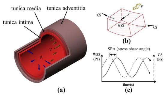 Schematic of the stress phase angle (SPA). (a) Three-layer structure of blood vessel wall. (b) Stress states of the tunica intima element. (c) CS and WSS change over time and SPA calculation. Blood pressure (P) induces CS, and blood flow (V) causes WSS.