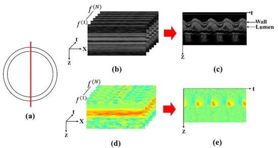 M-mode extraction process. (a) Position of the M-mode scan (red line). (b) Structure images of the multi-M-mode scan. (c) Final structure M-mode image extracted from the single M-mode scan A-lines average. (d) The corresponding Doppler flow image of (b). (e) Final Doppler flow M-mode image corresponding to (c).