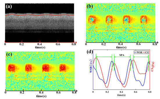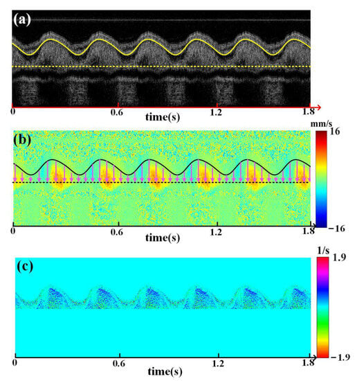 According to the previous analysis, blood vessel diameter variation can be used for the phase of the CS extraction. For the achieved structure M-mode image, the variation of blood vessel diameter can be assumed to be in phase with the fluctuation of blood vessel boundary since the M-mode image was acquired at the middle of the blood vessel (Figure 4a). Boundary segmentation was performed on the M-mode structural image. Firstly, grayscale transformation was applied for image enhancement, and a Gaussian high-pass filter was used to highlight the image edge. Secondly, the boundaries were enhanced by the 4 × 1 descending gradient template ([1, 1, −1, −1]). Lastly, morphological operations (open and closed operations) were employed to extract boundaries. Figure 5a illustrates the result of boundary segmentation in the structure M-mode image (solid yellow line) of chicken embryo OFT. The fluctuation of the blood vessel boundary corresponds to the variation of the CS. Based on the segmented boundary, the WSR of blood can be calculated in a Doppler flow M-mode image (Figure 5b), and the result is shown in Figure 5c. Thus, the SPA of blood vessels can be achieved according to Equation (8).