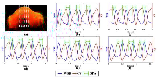 SPA measurement at different positions of chick embryo OFT. (a) Positions selection on the OFT to measure the SPA (white dashed line 1–5: five positions for SPA measurement); (b–f) Curves of the WSR and CS for the SPA extraction.