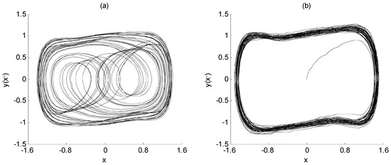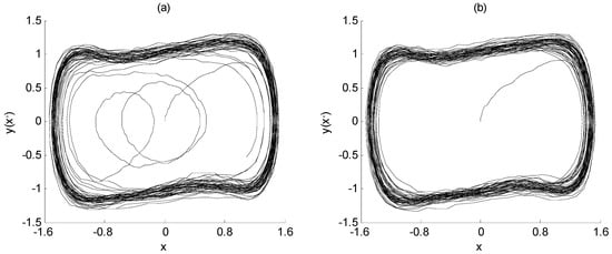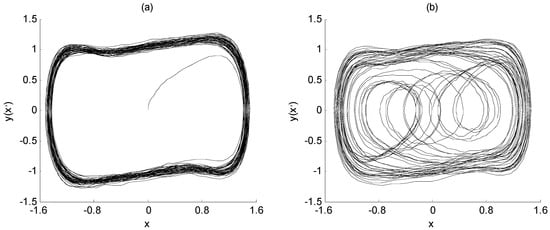 Define SNR = 10 × log(pa/pn), where pa represents the mean square value of characteristic signal a(t), and pn represents the strength of interference signal n(t). From this, the SNR of the characteristic signal and the noise interference signal in Equation (3) is about −25 dB. At this time, it is difficult to extract the characteristic signal directly from the noise n(t) through spectrum analysis. However, if the Duffing chaos system is placed in the critical state of the transformation from a chaotic state to a large-scale periodic state, and the signal a(t) + n(t) is taken as the input of the Duffing chaos system in this state, the frequency value of the characteristic signal can be identified from the output state of the Duffing chaos system, which is Equation (3). When the signal a(t) + n(t) is not considered, the output state of the Duffing chaos system is shown in Figure 1a. On the other hand, while the noisy signal a(t) + n(t) is added, the output state of Duffing chaos system is shown in Figure 1b. The ordinate y in the figure represents x’.