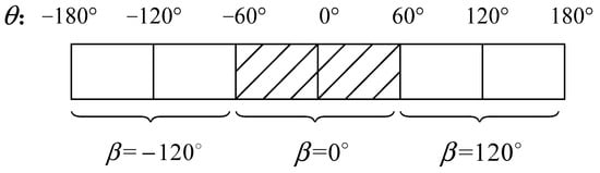 It can be seen from Figure 3 that if the detection window is to be fully covered in the whole range [−π, π], it can be realized by adjusting the initial phase angle of the drive signal. Specifically, when the initial phase angle β of the drive signal is set as −120°, the corresponding detection window of θ is from −180° to −60°. When β is set as 120°, the corresponding detection window of θ is from 60° to −180°. Therefore, in this section, the tradition Duffing system, which was shown in Equation (7), will be expanded to an array Duffing system which is composed of three Duffing equations with different initial phase angles of driving signals. Then, the all-phase frequency detection of characteristic signals is realized. The array Duffing system for all-phase frequency detection is as follows.