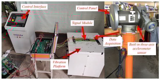 The main equipment of the HILS experimental platform are shown in Figure 4, which includes a clinometer calibration, a six-dimensional space vibration experimental platform and its control device. The model of the clinometer is TX-3S, which is equipped with a three-axis accelerometer sensor, and the sensor parameters are shown in Table 1. By changing the angle of the control panel, the attitude of the drilling tool during the drilling process can be simulated, including inclination, azimuth and tool face angle. On the other hand, the space vibration platform could be set through the control interface to generate noise interference signals of different intensities, frequencies and gradient to simulate the strong vibration environment in the pit.