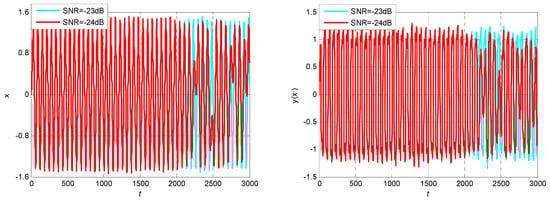 The curve of another output item y with time under different SNR conditions is shown in Figure 11. It can be seen that the change trend is very similar to output item x, but the change range is different. Therefore, the influence of noise on parameter estimation based on the chaotic effect is greater than that of frequency detection. Specifically, the SNR threshold of the detectable signal during frequency detection is −23 dB, which is lower than the SNR threshold of the detectable signal during parameter estimation, which is −21 dB.
