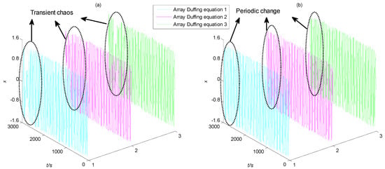 It can be seen from Figure 10a that when the SNR of the characteristic signal is −23 dB, the output term x of the three array Duffing equations changes periodically with time in the first 2700 s of the simulation time, with a range of −1.6 to 1.6. However, after about 2700 s, the trend of change is transient chaos, and the range of change is far less than ±1.6. On the other hand, it can be seen from Figure 10b that when the SNR of the characteristic signal is increased to −21 dB, the output term x of the three array Duffing equations change periodically with time during the whole simulation process, with a range of no more than ±1.6. The change trend has obvious regularity.