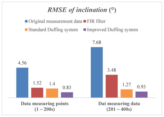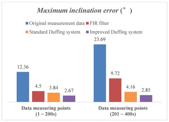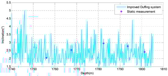 In order to further evaluate the overall performance of the proposed method, the data after the improved Duffing system was implemented were used to obtain the real-time inclination of the drilling tool. There was no interference of vibration acceleration in the attitude measurement of the stopping of the drilling, which ensures the accuracy of the attitude parameters, such as inclination. Therefore, it was used as a reference value to verify the detective performance of the improved Duffing system. The solution results of the inclination obtained by the proposed algorithm are given in Figure 16. As a comparison, the static measurement results of five data points are also given in Figure 16. As a comparison, the results of other algorithms for these five points were also statistically analyzed, including FIR filtering and the standard Duffing system. The statistical results are shown in Table 6.