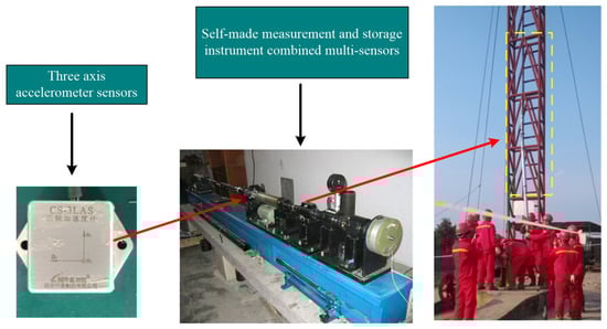 In order to further verify the performance of the proposed weak signal detection method for dynamic MWD signal, field-drilling data were used for testing and analysis. The experimental data came from the field-drilling process of a well in northern Shaanxi. The field-acquisition process and installation position of the triaxial accelerometer sensors are shown in Figure 15, and the drilling environment parameters are listed in Table 4. During drilling, the guiding tool was in a stable and straight state.