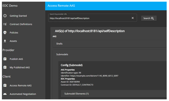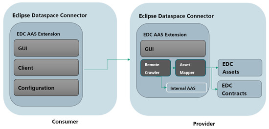 On the consumer side, the EDC Extension for the AAS provides GUI, client, and configuration modules. The GUI module is a web-based service to simplify interaction with the client and configuration modules. The configuration module allows consumers and providers to make changes to their EDC without editing configuration files. For example, several EDC settings and configurations of the default contract can be changed here. The client module is a simple EDC client to simplify the AAS data request for consumers. For this, it bundles several API calls and lets the consumer decide if new contracts should be accepted. Figure 9 shows the complete view with interactions between provider and consumer. It should be noted that the EDC extension always contains all modules of both provider and consumer, but only the relevant modules for each are shown in Figure 9. In conjunction, a consumer can, at any time, become a provider and provide AASs while consuming AAS data.
