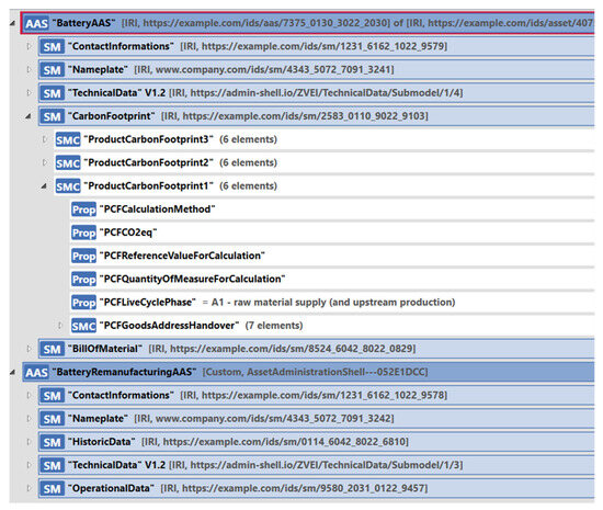 In this section, we go into more detail on how our approach can be applied in a concrete use case. For this, we want to model an AAS for a car battery and an AAS for the disassembly of the battery. As a complete DPP for the battery is still a work in progress, we modeled only some key aspects with AAS submodels. We introduced the recently released product carbon footprint (PCF) [39] submodel template into the model to describe the carbon footprint of the battery inside the AAS. We also used the digital nameplate template to provide identifying information about the battery. For other submodels, we created our own templates, which will be replaced in the future. The AASs are shown in the AASX Package Explorer tool [45] in Figure 10.