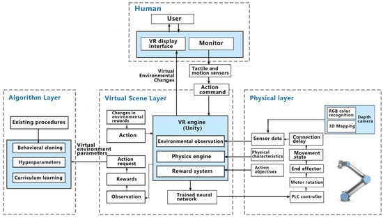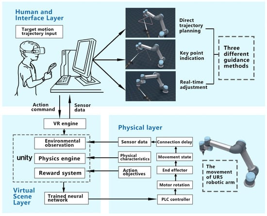As delineated in the earlier “completed work” section, during task configuration, the operator is required to specify the desired motion trajectory of the robotic arm. This human–machine interaction necessitates the system to offer guidance and support throughout its execution. This is twofold: Primarily, it ensures the accuracy of the intended motion and thereby ensures task completion quality. Additionally, user needs assessment indicates that interactive guidance is the paramount demand. Consequently, the guidance mode for the digital twin manipulator’s target motion trajectory emerges as a crucial aspect of this system’s interaction research. This also serves as a benchmark for digital twin interaction designs and research on analogous equipment. The operator at the control end inputs this process. Subsequently, the finalized trajectory is transposed onto the motion of the actual robotic arm through apparatuses like virtual reality engines, neural networks, and PLC controllers. The detailed procedural logic is depicted in Figure 3.