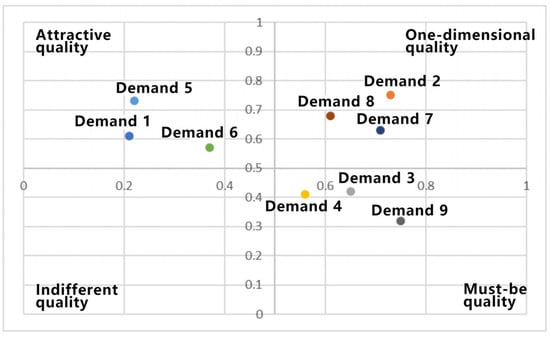 The questionnaire was designed to evaluate nine specific needs. Respondents were prompted to rate each need based on the following dimensions: “I really like it”, “It should be”, “Indifferent”, “Settle for”, and “I really do not like it”. The aggregated scoring outcomes are presented in Table 2. For the KANO model’s feature attributes, the numerical calculation method involves summing the values of A, O, M, I, R, and Q from the table and then dividing by the product of 25 and 44.