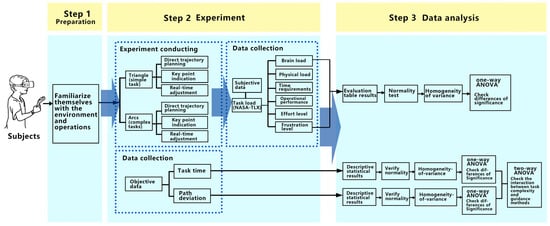 In the experiment, the input guidance methods for the target motion trajectory encompass direct trajectory planning, key point indication, and real-time adjustments, all intended to enhance user experience. These guidance methods each have distinct characteristics, presenting both advantages and disadvantages in specific task contexts. Users, in turn, exhibit varied preferences towards these interaction techniques, leading to differential work efficiencies. Utilizing a data-driven methodology, this article seeks to capture these nuances in preferences, experiences, and efficiencies to facilitate a comprehensive analysis, discussion, and interpretation of the experiments. Consequently, the experiment’s objective is to contrast the variances in task completion efficiency and interaction among the diverse guidance methods, especially as applied to robotic arm tasks, by quantifying the interactive operational experience.