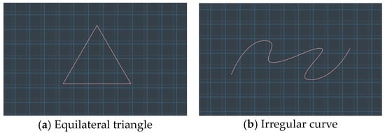 Before commencement, the desired motion trajectory for the end effector was visualized on the screen. Participants were instructed to use three guiding methods to traverse two distinct trajectories: an equilateral triangle (side length: 1 m) and a curved pathway (total length: 3 m), as depicted in Figure 6. Subsequently, the robotic arm retraced the path charted by the participants, initiating from the start and culminating at the terminus. For experimental simplicity, the robotic arm’s movement was standardized at a steady pace of 1 m/s, overlooking joint influence and motor acceleration durations. Upon task culmination, metrics like completion time and the robotic arm’s path deviations during its course were systematically recorded.