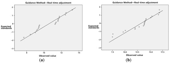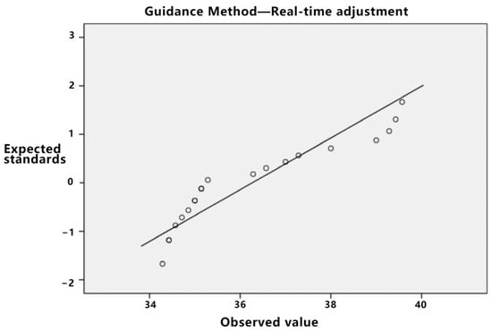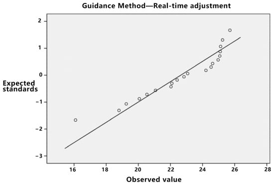 Initially, the data distribution’s normality was assessed. As delineated in Table 5, the p-value for both direct trajectory planning and real-time adjustment, when subjected to the Kolmogorov–Smirnov test, is less than 0.05, albeit proximate to this threshold. Given the limited sample size, asserting the normality of the data can be challenging, especially in light of stringent normality test criteria. Consequently, utilizing normal or Q-Q plots is advised for normality verification. If the data exhibit attributes consistent with normality, they can be deemed to follow a normal distribution.