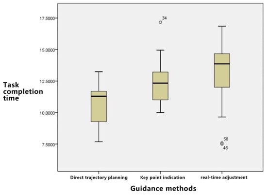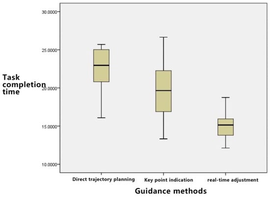Table 4 shows the descriptive statistical results of the three guidance methods and task completion time. The direct trajectory planning task has the shortest completion time, followed by the key point and real-time adjustment methods.