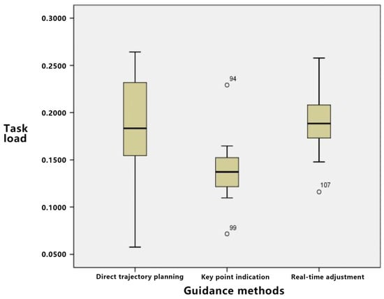 The analyses pertaining to execution time and path deviation underscored the tangible impact of the three guidance methods on task efficiency and accuracy. These become integral to the user’s interaction experience during operations. For complex tasks, a pronounced execution time, considerable path deviation, and a heightened reliance on the operator’s proficiency and experience were observed. The key point indication method consistently showcased commendable performance across both task complexities, characterized by optimal execution times and minimal path deviations. Nonetheless, this method’s efficacy may be contingent upon the operator’s expertise. The real-time adjustment approach facilitates swift trajectory modifications during intricate tasks, leading to reduced execution times. Conversely, its application to simpler tasks results in elongated execution times and amplified path deviations.