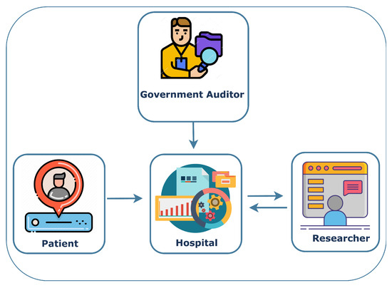 In a real-life scenario, following the reforms made by the GDPR [5], along with the implications and the establishment of European Health Data Space in 2022 [64], the data subject has been considered as a patient whose data is being recorded in the hospital upon her checkups. Likewise, the hospital has been regarded as a data controller, a centralized entity that obtains, stores, and processes the patient’s sensitive data after their explicit and unambiguous consent. Furthermore, a data requester/processor has been viewed as a researcher or a group of researchers from a particular university who need patient data for their research-related tasks. Above in Figure 1, we detailed the dynamic consent management system’s entities in general, but here in Figure 7, we are mapping them to patient data/consent management by the hospital and consequently sharing it with the researcher. In Figure 7, Patients refer to the data subjects (DSs) who are sharing their data/consent with the hospital that is acting as a data controller (DC). The government auditor is represented by the data auditor (DA), who will ensure that the hospital (DC) is adhering to the regulations while processing the patient’s (DSs) data/consent. Likewise, the researcher (DR) actually refers to the data requester who acquires patients’ data to perform his research-related assignments.