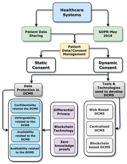 Vigt et al. in [5] and Gstrein et al. in [6] demonstrated further the design of a dynamic consent management system; they stated that when designing a DCMS, five prerequisites must be satisfied: (i) consent should be willingly disseminated, meaning that individuals should have the option to give or withhold consent freely and without coercion; (ii) consent must be explicit, indicating that it should be given through a specific and affirmative action or statement; (iii) consent must be informed, meaning that individuals should have access to all necessary information regarding the processing of their data before giving consent; (iv) consent must be precise, indicating that it should be specific to the particular processing activities and purposes for which it is being given, and (v) conceded consent must be cancellable, meaning that individuals should have the right to withdraw their consent at any time. The GDPR framework provides guidance and recommendations on how organizations handle and process individuals’ confidential data [5]. There can be numerous applications where dynamic consent management systems can be applied. However, in the existing literature, the leading research is being done on implementing dynamic consent management systems for the healthcare sector in order to create sustainable e-healthcare services with the implications of state-of-the-art tools, systems, and technologies.