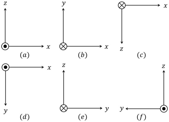Six positions (a–f). The six positions of the IMU are indicated by the directions of each orthogonal axis of the IMU. The reference direction corresponds to a vector pointing towards the reader, represented by a dot within a circle. A vector pointing in the opposite direction away from the reader is represented by a cross within a circle.