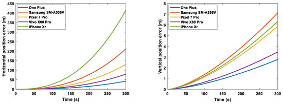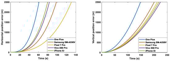 For the five smartphones considered, the following figures show the short-term straight-line position error SD growth per axis due to the noise and bias values determined in Section 3, with an initial position error of 10 m, initial velocity error of 0.1 m/s, and initial attitude error of 0.01 rad. The figure on the left displays the horizontal error, while the one on the right illustrates the vertical error. In particular, Figure 8 shows the total error accounting for bias, noise, and errors in the initial condition, while Figure 9 shows the error due to the noise contribution only. We can see that the largest horizontal position error in Figure 8 is accumulated with the MEMS errors of the One Plus 7 Pro, while the smallest is with the ones of the Pixel 7 Pro. This is expected, since the MEMS measurements of the One Plus 7 Pro had the highest accelerometer and gyro bias values, while the ones of the Pixel 7 Pro had the lowest gyro bias. It is interesting to see in Figure 9 that, if noise was the only source of error, the One Plus would outperform, since it showed the lowest noise SD values, but as shown in Figure 8, because of the strongest impact of its large accelerometer and gyro biases, it accumulated the largest position error.