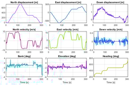 Figure 11 shows the motion profile as the North, East, Down (NED) displacements and velocity, bank, elevation, and heading of the reference trajectory. The motion profile includes five turns of approximately 90 deg, with a maximum speed of approximately 10 m/s.