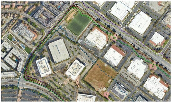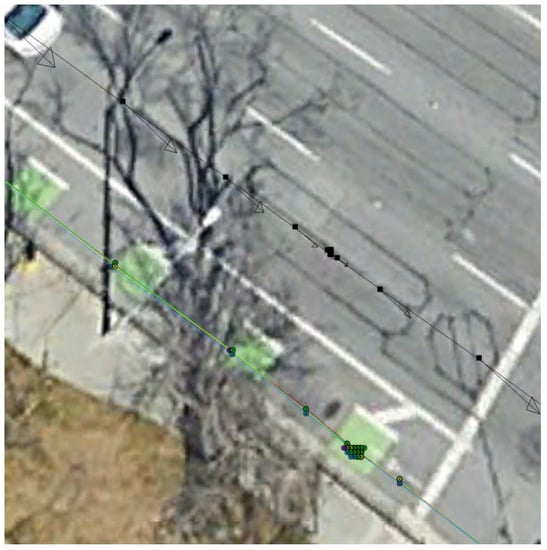 Figure 12 shows the kml tracks of the five estimated position solutions obtained with the MEMS measurements of the five considered smartphones, as well as the track of the reference solution, with a mask angle of 10 deg. In general, from Figure 12, there are no evident performance differences. For all the considered smartphones, the GNSS observations from the available seven satellites successfully corrected the inertial solution and prevented any error drift. Small positioning differences can be recognized when zooming into Figure 12, as shown in Figure 13. Some more evident differences in the velocity and especially the attitude estimation errors can be observed by directly comparing the velocity and attitude error components. Figure 14 and Figure 15 show the lowest velocity and attitude estimation errors (obtained with the MEMS errors of the Pixel 7 Pro) and the largest ones (obtained with the MEMS errors of the One Plus 7 Pro), respectively.