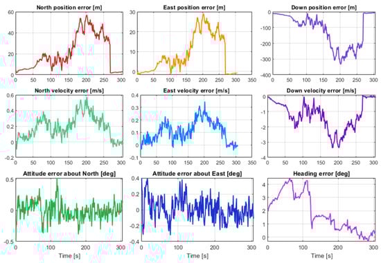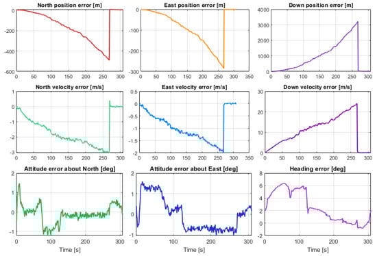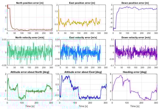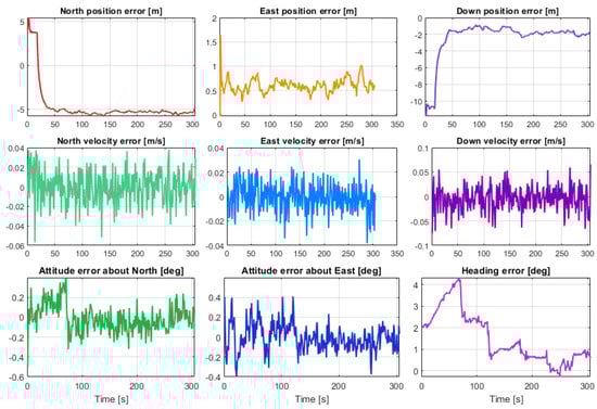 In order to analyze the effect of inertial error propagation, we can evaluate the short-term error propagation given the noise SD and bias values determined in Section 3 and some errors in the initial position, velocity, and attitude states.