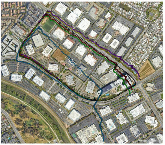 Kml trajectories of reference IMU in black, iPhone XR in green, One Plus 7 Pro in light blue, Vivo X60 Pro in purple, Google Pixel 7 Pro in yellow, and Samsung SM-A536V in red, when assuming a mask angle of 10 deg.