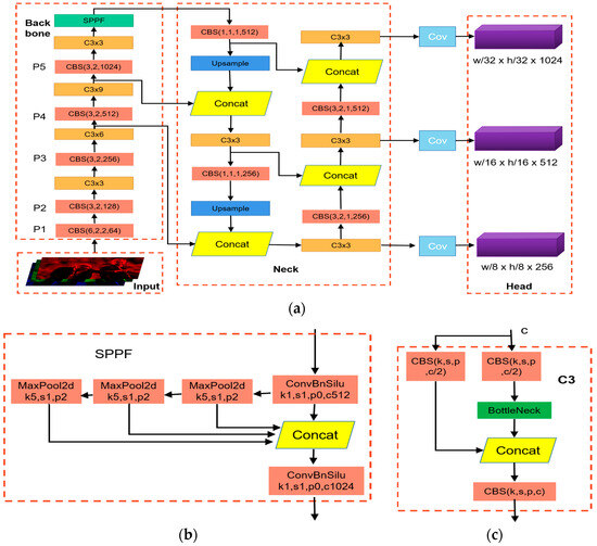 Network structure of YOLOv5. (a) Overall model framework with four components: Input, Backbone, Neck, and Head. Here, CBS is convolution, batch normalization, and SiLU activation, and C3 × n denotes n C3 layers. The image is initially fed into the Backbone structure for feature extraction. Subsequently, the Neck structure further integrates the extracted features, which are then input into the Head structure for final predictions. (b) Structural diagram of spatial pyramid pooling module. (c) C3 structure.