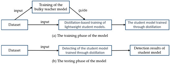Distillation procedures. (a) Distillation training phase. During that phase, the teacher model was trained, and then the student model was trained, guided by the teacher model. (b) Testing phase. Here, the trained student model performed image detection and inference on the input image, with no involvement of the teacher model.