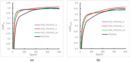 In comparing Figure 5a,b, consistent trends were found in the experimental results of mAP50 and mAP50–90, indicating that the experiments accurately identified the existing problems. Additionally, the comparison between FGD-YOLOv5s_n and YOLOv5s showed that the FGD distillation method was effective for the YOLO detector, with substantial improvements in the detection accuracy and convergence speed of the student detector.