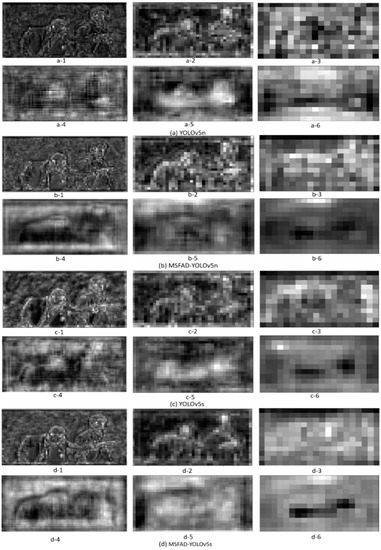 To determine the effectiveness of the MSFAD method, the feature maps of each model were visualized before and after distillation for the feature maps output by the backbone structure and neck structure. Figure 6 shows the visualization results, where in each group of six images, the first three feature maps were output by the backbone and the second three by the model head. The results indicate that the distillation process markedly improved the feature maps of the model. Specifically, the model head feature maps b-1, b-2, d-1, and d-2 after distillation had more precise features and a better suppression of background noise than the backbone feature maps a-1, a-2, c-1, and c-2 before distillation. Furthermore, b-3 and d-3 after distillation extracted more abstract semantic features than a-3 and c-3, demonstrating that the backbone had more robust feature extraction capability after distillation. Similarly, compared to the feature maps a-4, a-5, c-4, and c-5 output by the head before distillation, the feature maps b-4, b-5, d-4, and d-5 after distillation had cleaner backgrounds, enabling a clearer representation of the posture of the two people. Moreover, b-6 and d-6 after distillation displayed the position information of the two people more clearly and accurately than did a-6 and c-6, with better foreground and background separation.