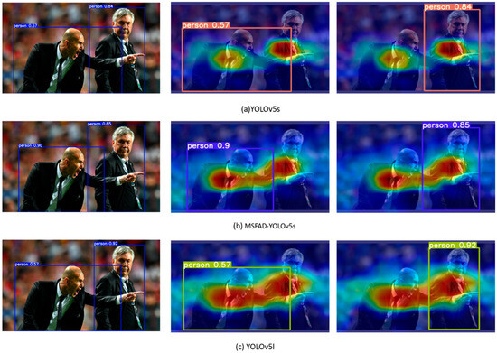 To verify the actual performance of the student detector distilled using the MSFAD method, the detection performances of the models were compared before and after distillation. Heat maps of the detected regions visualized with the use of gradient-weighted class activation mapping (Grad-CAM) [44] are shown in Figure 7. The images in the left column demonstrate the inference results of each model, showing that MSFAD-YOLOv5s distilled by the MSFAD method showed substantially higher detection accuracy than that of the detector before distillation, with the detection accuracy of the person on the left in the images even exceeding that of the teacher detector. The images in the right column display the target regions to which the detector paid attention, demonstrating that the regions of interest of MSFAD-YOLOv5s after distillation were highly similar to those of the teacher network. Relative to the detector before distillation, the target regions to which MSFAD-YOLOv5s paid attention are more precise in position and darker in color. Those results indicate that the MSFAD method can help the student detector accurately identify the features of target categories, leading to higher detection accuracy.