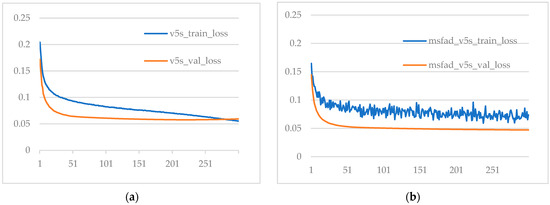 Figure 8 shows the loss curves of the model before and after distillation on the training and validation sets. Comparing Figure 8a,b, it can be concluded that the student detector after MSFAD distillation did not have overfitting. On the contrary, the loss of the student detector after distillation on the validation set was less than that of the model before distillation, indicating that the model after distillation performed better on the validation set.