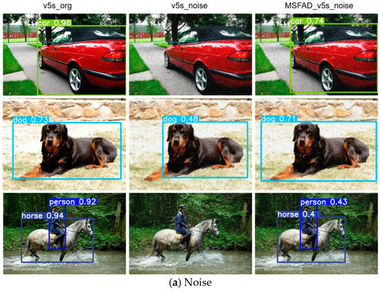 Figure 9a shows the marked decline in detection performance of the non-distilled model when exposed to noise disturbances, to the extent that it failed to detect targets within the image. In contrast, the model distilled with MSFAD effectively mitigated the effect of noise, resulting in a marked improvement in model stability against noise interference.