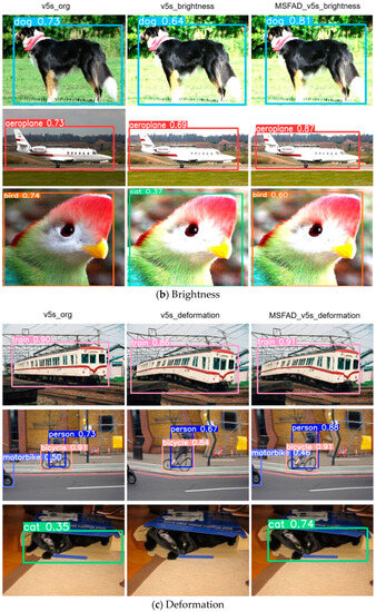 Figure 9b highlights the discernible reduction in detection accuracy of the nondistilled model when the image’s brightness was adjusted. This decline became evident when a bird was inaccurately identified as a cat. Conversely, the distilled model adeptly mitigated the unfavorable effects of brightness modifications. Remarkably, the detection accuracy of specific targets exceeded that achieved during normal image detection. This pronounced improvement shows the increased stability of student detectors when confronted with fluctuations in brightness.