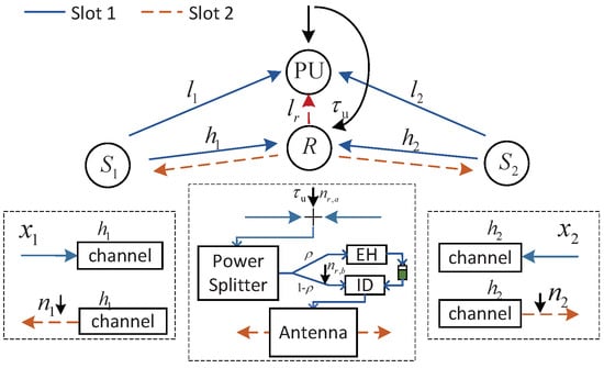 Relaying often causes energy consumption issues, and forcing idle users to use their own energy to help the relay is difficult. Therefore, the energy issue in cognitive relay networks has become a topic of substantial research interest []. Introducing radio frequency (RF) wireless energy harvesting (EH) technology into cognitive relay networks could potentially solve both the energy and spectrum problems, which has attracted significant attention in the academic communities []. In [], He et al. derive and compare the outage probabilities of the primary network and the EH cognitive network under direct transmission, single-user cooperation and multi-user cooperation scenarios. In [], Shome et al. investigate the error probability of an energy harvesting co-operative cognitive radio network with several relay selection criteria. Wang et al. [] study an energy harvesting-based secure transmission scheme for cognitive multi-relay networks and analyze the average secrecy rate, the secondary secrecy outage probability and the ergodic secrecy rate. More recently, some researchers have begun to study the SWIPT protocols and resource allocation for cognitive AF two-way relay networks [,]. The optimization model of [] aims to maximize the total transmission throughput of the system, and the authors propose an algorithm by optimizing the transmit power of sensor nodes. In [], the approximate closed-form expression of minimizing the outage probability and throughput is taken as the optimization objective, and the closed-form solution of the optimal power control parameters and power partition ratio are obtained. Shukla et al. [] evaluate the performance of the proposed SWIPT-enabled NOMA system by considering both the perfect and imperfect successive interference cancellation for the legitimate users over Nakagami-m fading in terms of outage probability, system throughput and energy efficiency.
